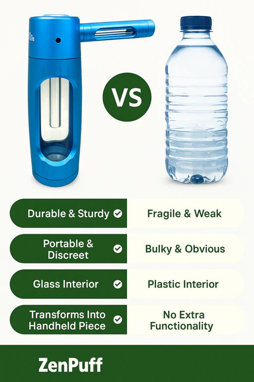 Yes. ZenPuff is lightweight, discreet, and shaped like a sleek water bottle, making it easy to carry in a bag or backpack without drawing attention, while its aluminum shell protects the glass interior during travel.